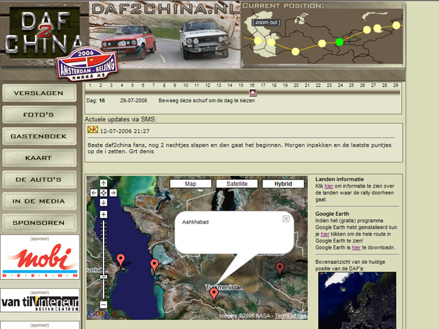 En...ik heb de website gemaakt. Een leuke uitdaging om de bestaande technieken uit isopreis.com te gebruiken op een andere site, een andere server en een ander domain. Het is geworden daf2china.nl en alle data komt middels XML van isopreis.com. Ook alle GPS~, SMS~ en andere fratsen zullen worden gebruikt.