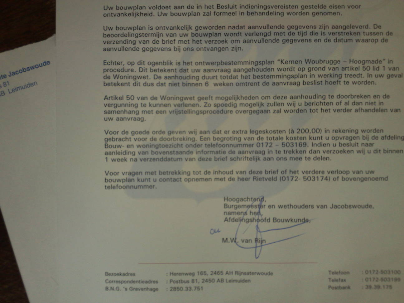 Zooo! Hoe kwaad kun je zijn op zo'n &^%##$@$#% gemeente ambtenaar! Ik heb het nummer gebeld om toch eens te vragen hoe het zit met die 200 euro extra. Dat komt dan vermoedelijk doordat ik een artikel 15 vrijstelling wil maar dat weet ze niet zeker. En we hebben de pech dat er twee bestemmingsplannen getoetst moeten worden en dan moet je ook twee keer leges betalen bla bla bla..